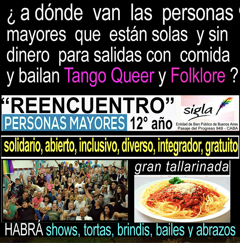 En ese taller nacieron también las campañas que hacemos hasta el día de hoy, ya van doce ediciones, que se llaman “Tangos contra el maltrato y abandono de las personas mayores”. Yo ya hacía los tangos contra la homofobia desde antes, y estas otras nacieron no porque yo me propusiera ver qué más podemos hacer, porque no había tiempo de hacer más cosas. Fue porque las personas me contaban todo el tiempo que se sentían solas, que se sentían abandonadas, que sus hijos no entendían que necesitaban más visitas. Me contaban qué sentían en sus casas, que se sentían mal, por cosas que años antes no les afectaban pero ahora eran como una herida. Por ejemplo, personas de 90 años que vivían con sus familias y contaban que escuchaban gritos, o que les gritaban, y para ellas era terrible. Y en la familia ni lo consideraban algo terrible. Esto era recurrente.